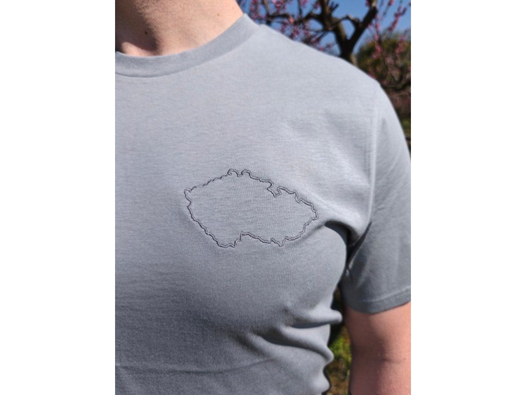 Minimalistický obrys České republiky doplněný jemnou výšivkou.